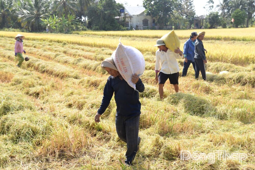 Còn tại các địa phương phía Tây của tỉnh, thời điểm này, nông dân cũng đang khẩn trương thu hoạch lúa đông xuân để chuẩn bị gieo sạ lại vụ xuân hè. Gia đình ông Lê Quốc Việt (ấp Tân Hưng Tây, xã Tân Phước 2, tỉnh Đồng Tháp) hiện đang canh tác 1,8 ha lúa. Vụ đông xuân này, gia đình ông gieo sạ giống lúa OM 18. Sau khi thu hoạch, lúa được các thương lái thu mua với giá 6.000 đồng/kg.