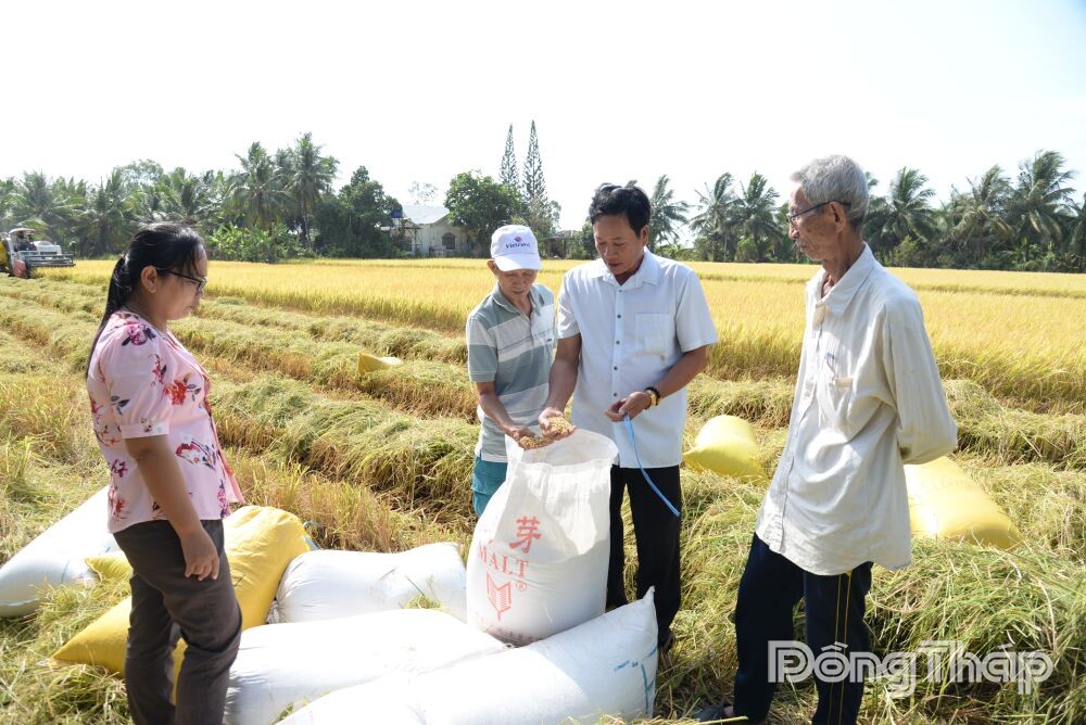 Ông Nguyễn Văn Tài, Giám đốc Hợp tác xã Dịch vụ Nông nghiệp Phước Trung xem lúa của thành viên thu hoạch trong sáng ngày 17-3.