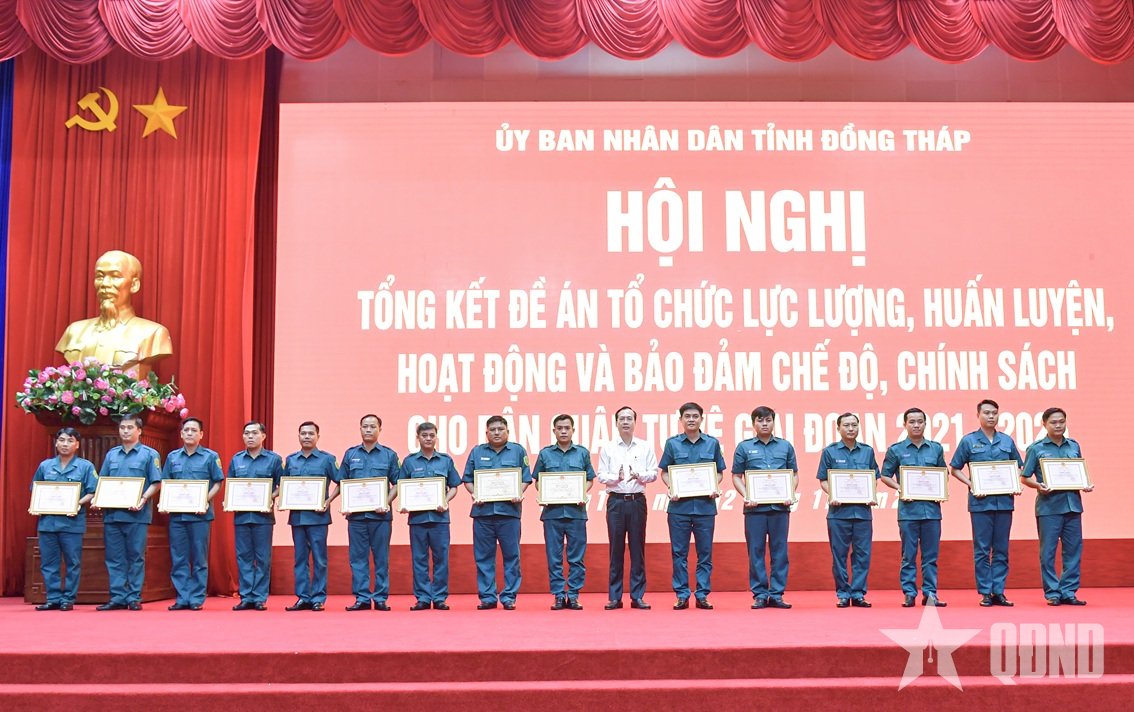 Dịp này, UBND tỉnh Đồng Tháp trao Bằng khen tặng 30 tập thể và 66 cá nhân đạt thành tích trong thực hiện Đề án tổ chức lực lượng, huấn luyện, hoạt động và bảo đảm chế độ chính sách đối với dân quân tự vệ, giai đoạn 2021 - 2025.