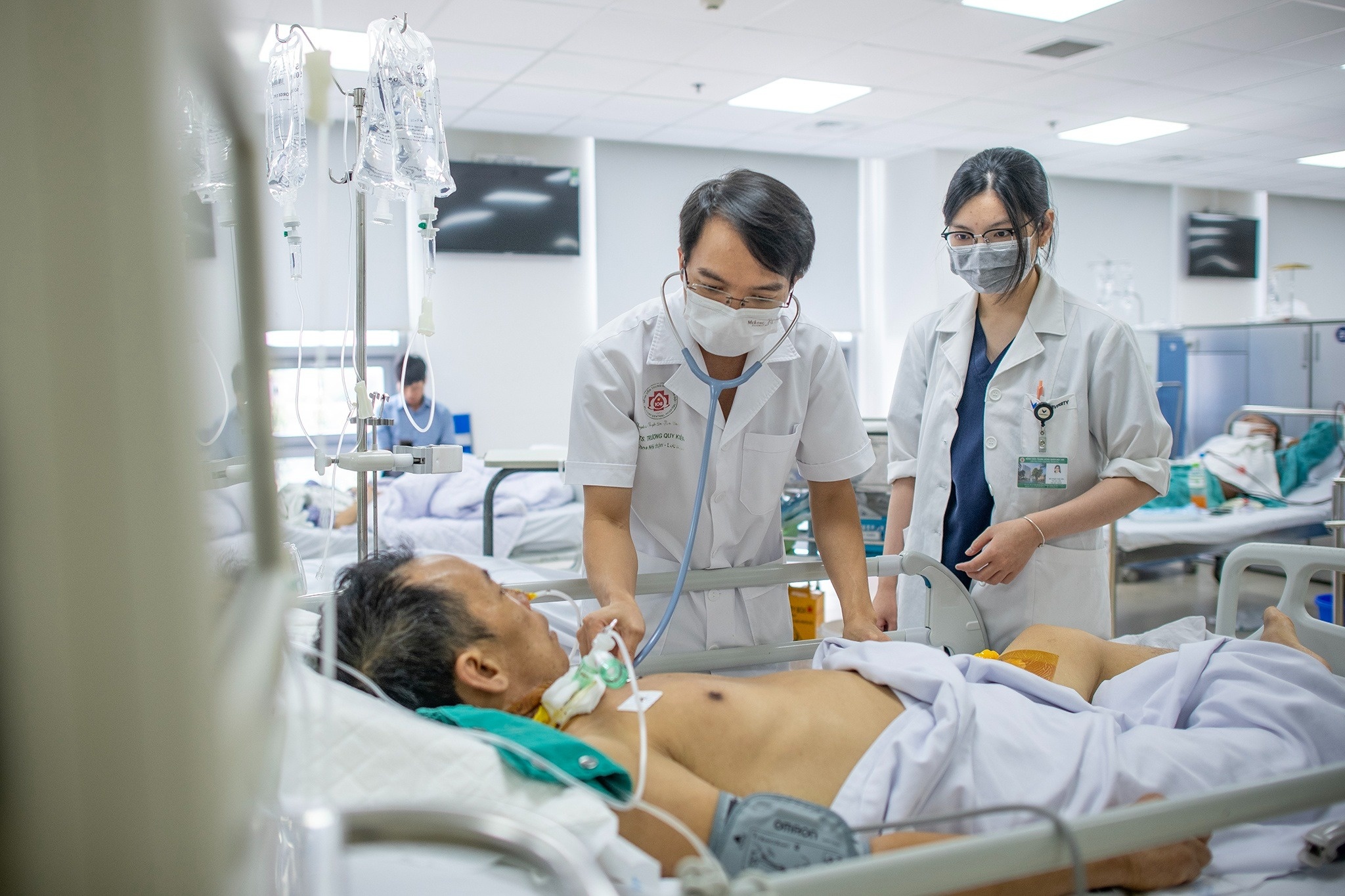 Bác sĩ Bệnh viện Trung ương Quân đội 108 đang thăm khám cho bệnh nhân. Ảnh: Việt Linh.