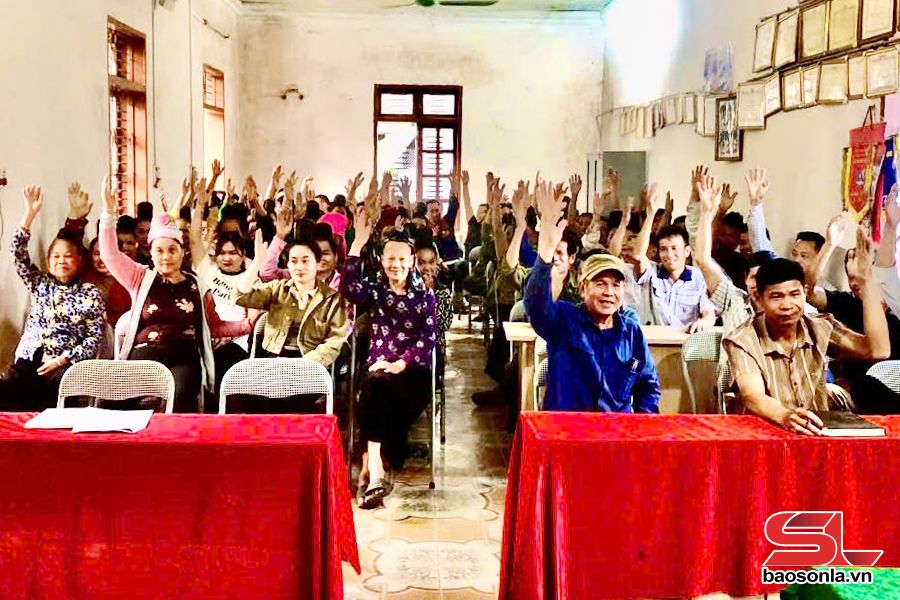 Cử tri đại diện các hộ gia đình tiểu khu Phiêng Nghè, thị trấn Yên Châu, huyện Yên Châu biểu quyết.