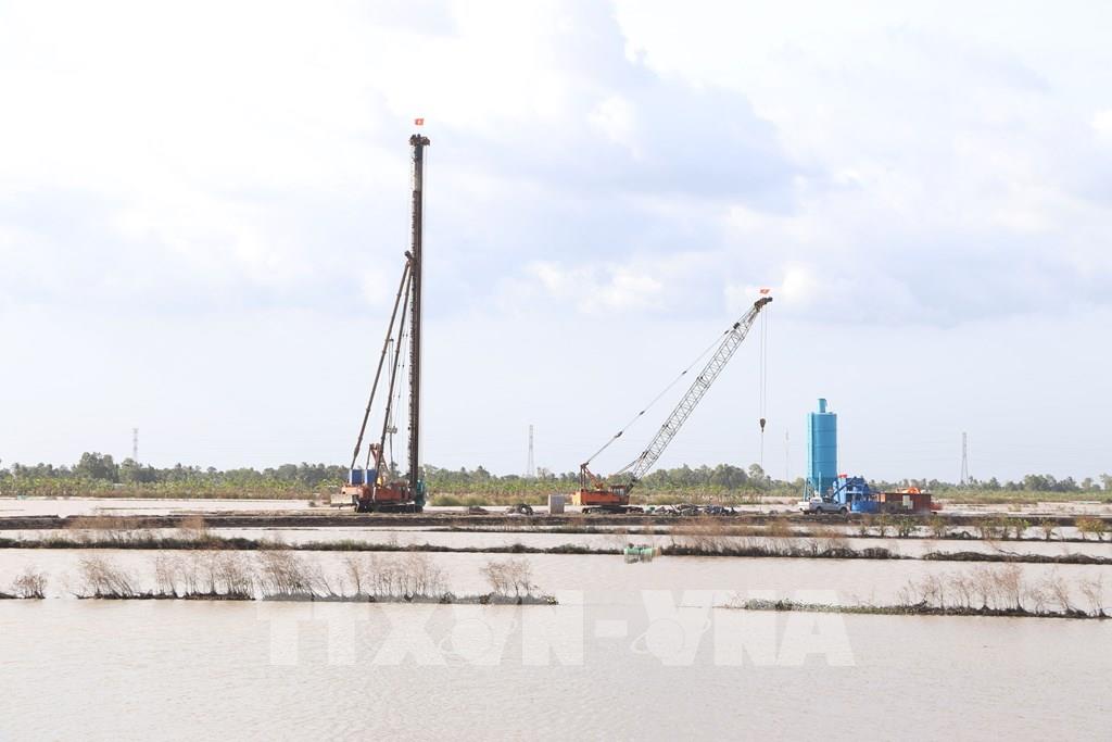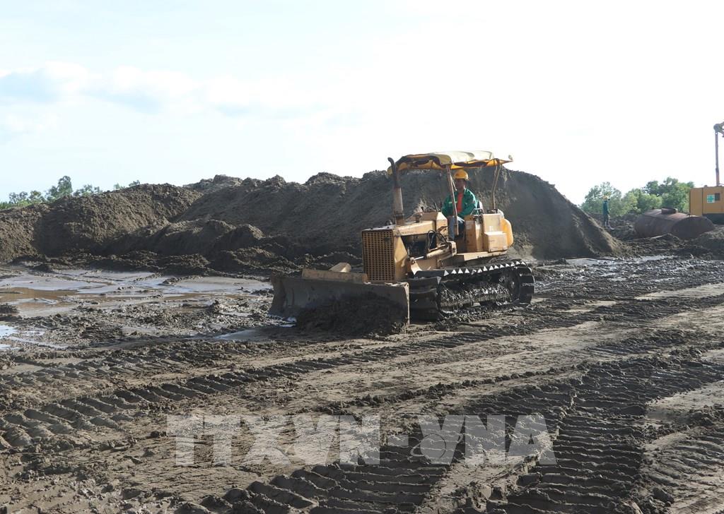 Đơn vị thi công triển khai thi công các hạng mục tại công trường cao tốc Cà Mau - Đất Mũi. Ảnh: Tuấn Phi-TTXVN