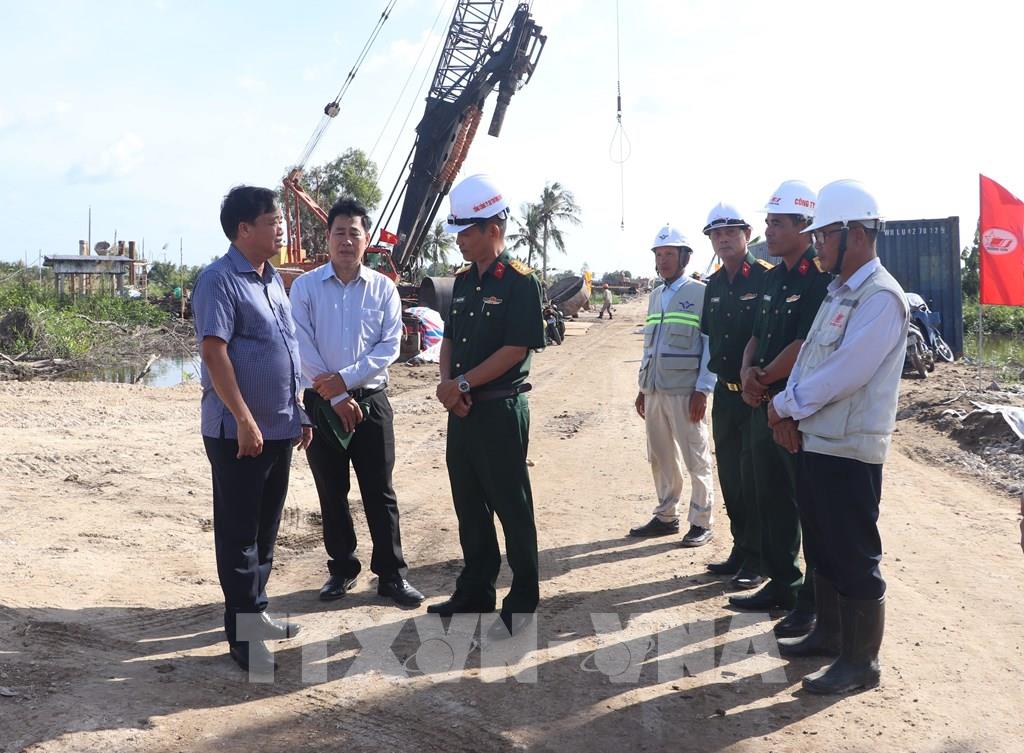 Phó Bí thư Thường trực Tỉnh ủy Cà Mau Huỳnh Quốc Việt kiểm tra tại công trường cao tốc cao tốc Cà Mau - Đất Mũi. Ảnh: Tuấn Phi-TTXVN