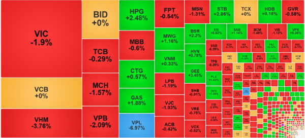 Khi các cổ phiếu vốn hóa lớn nhất có cải thiện giá, VN-Index lập tức hưởng lợi và hình thành nhịp phục hồi trong buổi chiều. Từ chỗ giảm sâu nhất 3,2% (-55,71 điểm), chỉ số đã leo dốc dần và đóng cửa còn giảm 0,75% (-13,05 điểm).