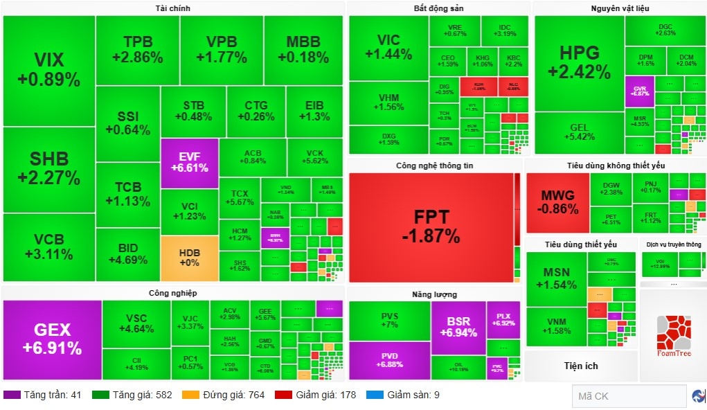 Nhóm VN30 kết phiên tăng hơn 21 điểm khi có tới 26 mã tăng và chỉ còn 3 mã giảm, 1 mã đứng giá Cụ thể, HDB đứng giá tham chiếu, FPT giảm 1,9%, VPL giảm 1,1% và MWG giảm 0,9%.
