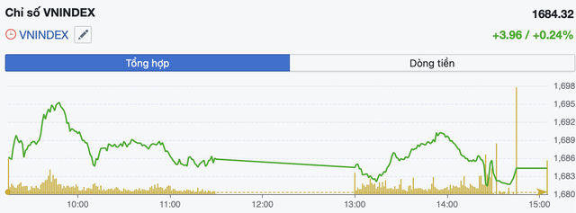 Cuối ngày, mức tăng của chỉ số thu hẹp khi VN-Index chốt ở 1.684,32 điểm, tăng nhẹ 3,96 điểm (+0,24%), đánh dấu phiên tăng thứ hai liên tiếp với 137 mã tăng và 171 mã giảm, số cổ phiếu giảm trên 1% cũng tăng từ 50 lên 77 mã.