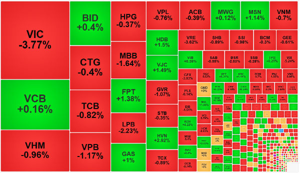 VN-Index chốt phiên giảm 0,71% tương đương -11,98 điểm dưới sức ép của nhóm trụ. Sáng nay đã không còn sự đồng thuận tốt ở cổ phiếu ngân hàng nên VIC giảm 3,77% tác động lớn. Chỉ riêng VIC đã lấy đi 5,2 điểm của chỉ số này, chưa kể VHM cũng giảm 0,96%, VPL giảm 0,76% và VRE giảm 3,62%.