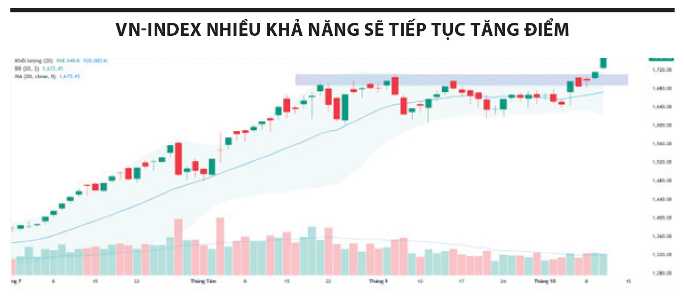 Trong tuần này, thị trường có cơ hội mở rộng đà tăng khi nhóm trụ duy trì sự tích cực, trong khi các ngành dẫn dắt khác như ngân hàng, chứng khoán, bán lẻ, xây dựng và vật liệu xây dựng ghi nhận tín hiệu dòng tiền khả quan. Vùng mục tiêu gần nhất là 1.780 điểm và xa hơn hướng tới 1.800 điểm. Vùng hỗ trợ ngắn hạn quanh 1.700 điểm đóng vai trò mốc quản trị rủi ro. Nhà đầu tư có thể tận dụng nhịp điều chỉnh trong tuần (nếu xảy ra) để giải ngân chọn lọc, ưu tiên cổ phiếu dẫn dắt và doanh nghiệp có kết quả kinh doanh quý III khả quan. Đồng thời, cần theo dõi diễn biến thanh khoản - nếu dòng tiền tiếp tục cải thiện, có thể gia tăng tỷ trọng khi xu hướng tăng được xác nhận.