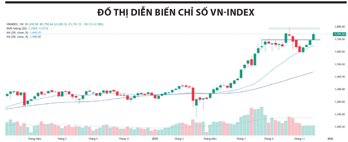 Dù áp lực chốt lời gia tăng trong phiên cuối tuần, chỉ số vẫn khép lại tuần trong sắc xanh với mức tăng 50,3 điểm (+2,98%), đóng cửa tại 1.741,32 điểm.