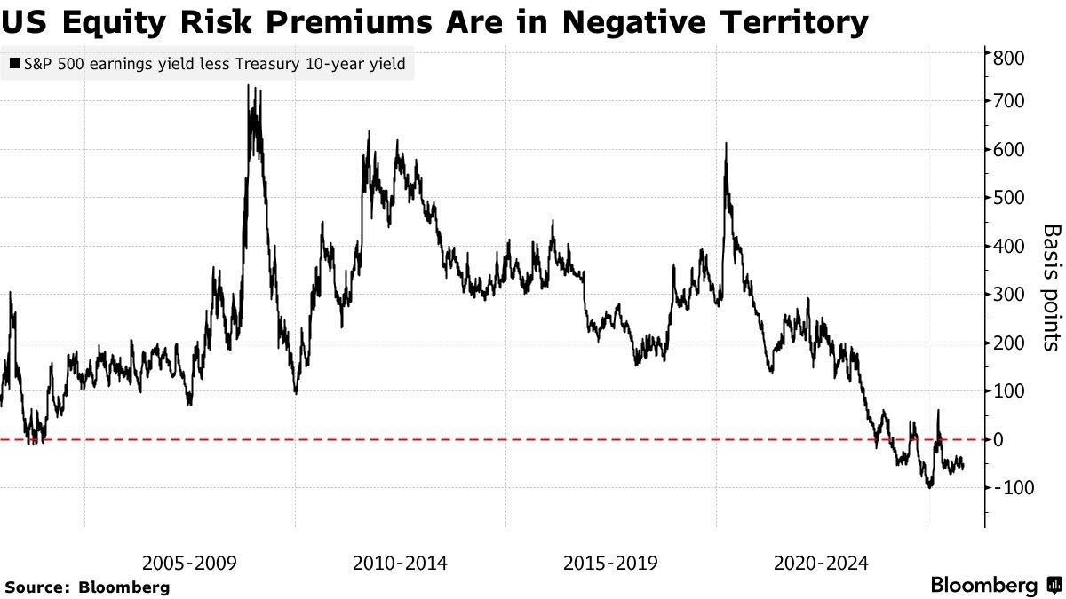 Tuy nhiên, phần bù rủi ro cổ phiếu Mỹ - đo bằng chênh lệch giữa lợi suất thu nhập của S&P 500 và lợi suất trái phiếu kho bạc Mỹ kỳ hạn 10 năm - hiện đã chuyển sang âm. Điều này có nghĩa là cổ phiếu Mỹ không còn mang lại lợi nhuận sau điều chỉnh rủi ro, theo các tính toán của Bloomberg.