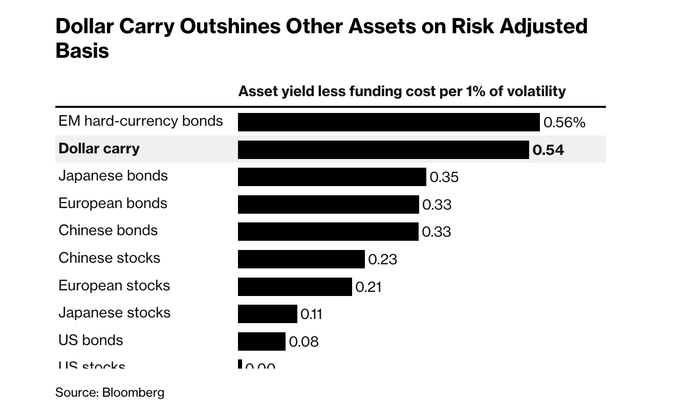 Theo tính toán của Bloomberg, chiến lược carry trade, tức vay vốn bằng các đồng tiền lãi suất thấp như yen Nhật hoặc franc Thụy Sĩ rồi đầu tư vào USD, có khả năng sinh lời vượt xa lợi suất kỳ vọng của thị trường chứng khoán châu Âu hay trái phiếu chính phủ Trung Quốc, khi tính đến yếu tố biến động của các tài sản này.