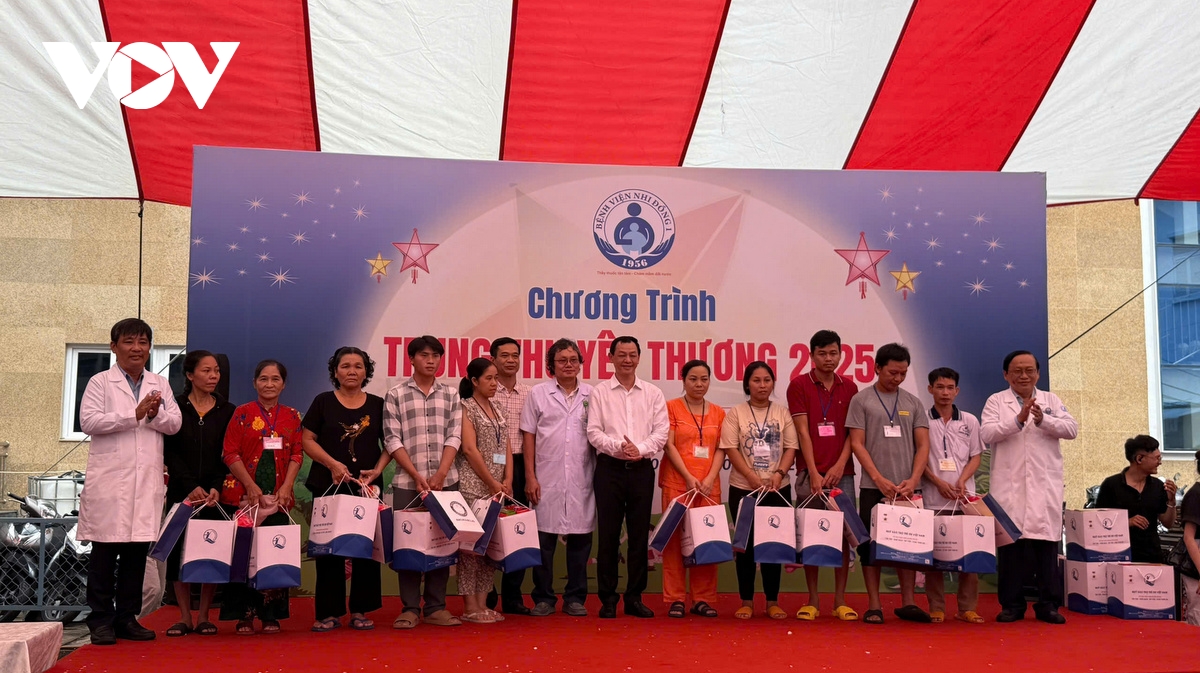 Thân nhân của các bệnh nhi khó khăn nhận phần quà từ mạnh thường quân và Thứ trưởng Bộ Y tế (Ảnh CTV Anh Kiệt)