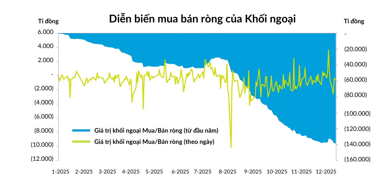 Kỳ vọng vốn ngoại trở lại vào đầu năm đã không diễn ra, thậm chí còn bán ròng kỷ lục. Cuối năm 2025, sau chuỗi bán ròng 4 tháng liên tiếp với giá trị giảm dần, khối ngoai đã quay trở lại mua ròng nhẹ trong tháng 12, dù với giá trị cũng khá khiêm tốn.