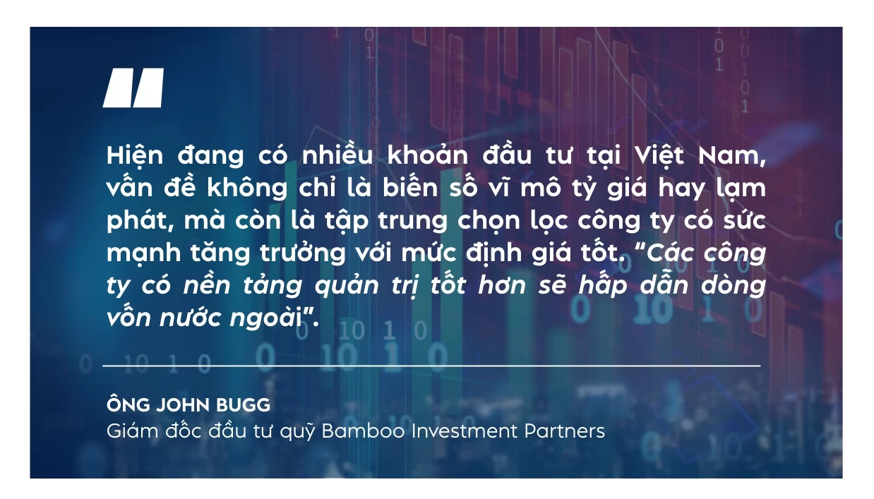 Theo ông John Bugg, Giám đốc đầu tư quỹ Bamboo Investment Partners, hiện đang có nhiều khoản đầu tư tại Việt Nam, vấn đề không chỉ là biến số vĩ mô tỷ giá hay lạm phát, mà còn là tập trung chọn lọc công ty có sức mạnh tăng trưởng với mức định giá tốt. “Các công ty có nền tảng quản trị tốt hơn sẽ hấp dẫn dòng vốn nước ngoài”, ông nói.