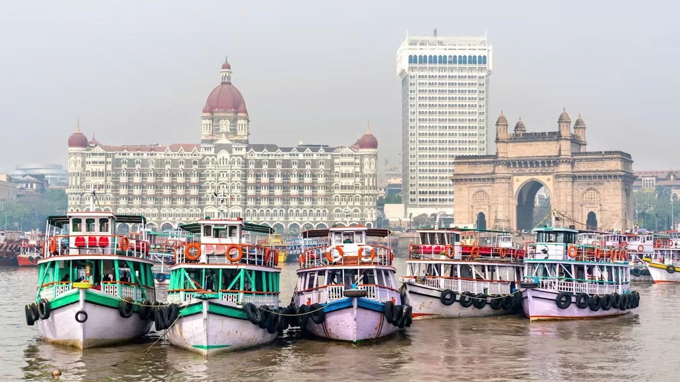 Những con thuyền neo đậu trên vịnh Mumbai, phía sau là Cổng Ấn Độ và khách sạn Taj Mahal Palace, hai biểu tượng đặc trưng của thành phố. Ảnh: Dreamstime