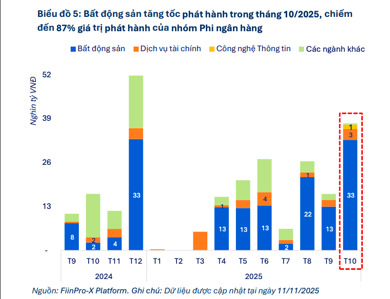 Chuyên gia FiinGroup phân tích, đà bứt phá của nhóm phi ngân hàng trong tháng 10 chủ yếu đến từ bất động sản, với 32,7 nghìn tỷ đồng phát hành mới – mức cao gấp nhiều lần tháng trước và gần tiệm cận đỉnh cuối năm 2024. Phần lớn giá trị đến từ các doanh nghiệp lần đầu huy động trong năm. Ngoài ra, sự trở lại của CMG sau nhiều năm vắng bóng cũng cho thấy tín hiệu tích cực về sự đa dạng hóa nguồn cung trên thị trường.