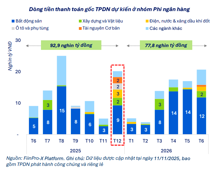 Dữ liệu từ FiinGroup cho thấy, trong tháng 12 tới, nhóm phi ngân hàng có hơn 20 nghìn tỷ đồng gốc đáo hạn, gấp gần bốn lần tháng 11, chủ yếu đến từ bất động sản với nhiều lô trái phiếu quy mô 1,5–3,6 nghìn tỷ đồng. Bước sang nửa đầu 2026, áp lực tiếp tục tăng khi nhóm này có gần 78 nghìn tỷ đồng đến hạn, riêng bất động sản chiếm 69%.