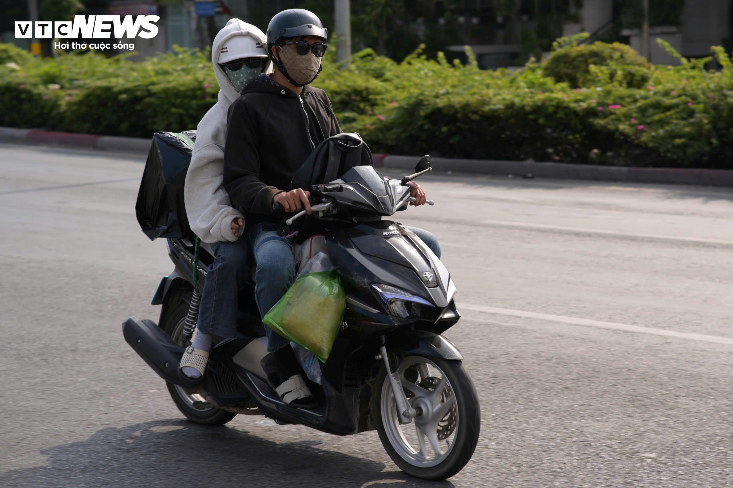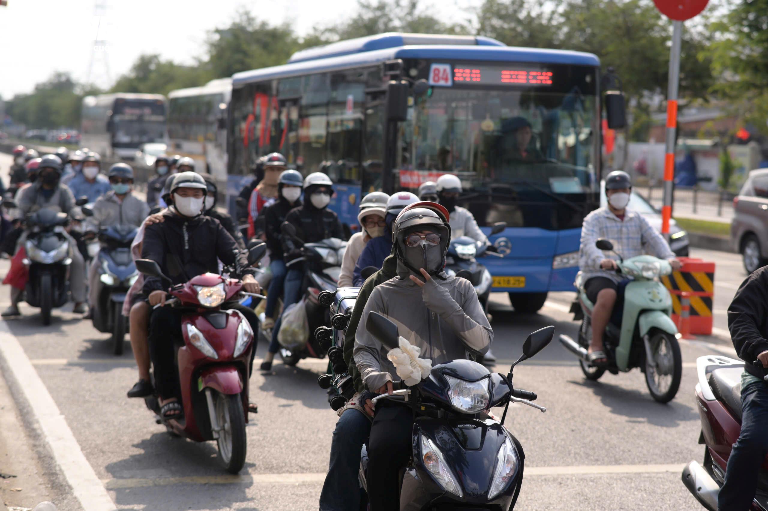 Phần lớn người dân chọn đi xe máy, phía sau chằng buộc vali, balô và các túi quà quê.