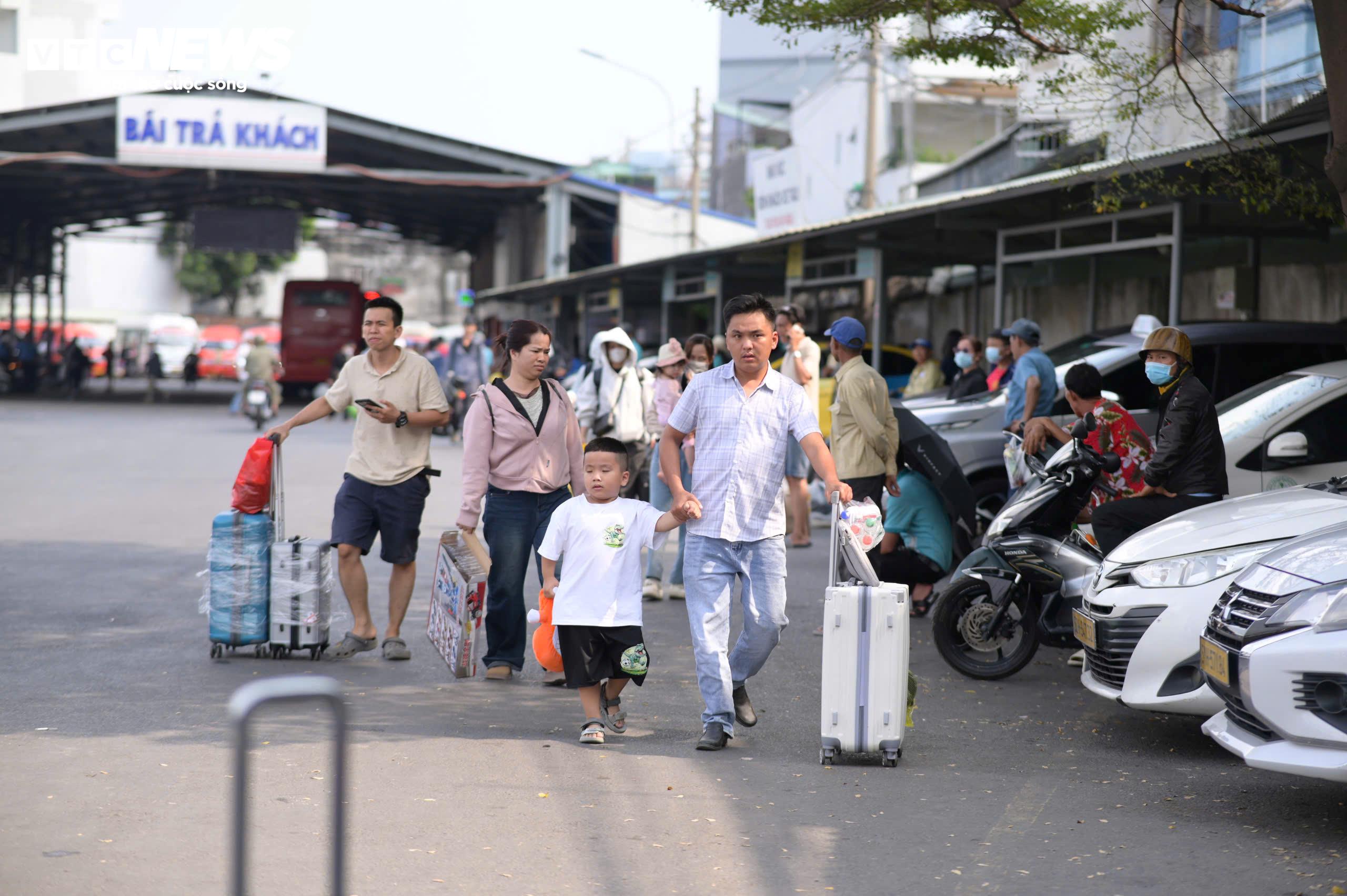 Nhân viên bến xe phối hợp với lực lượng chức năng điều tiết phương tiện trước cổng, hạn chế tình trạng dừng đỗ kéo dài gây cản trở giao thông. Nhiều người thân đứng chờ sẵn bên ngoài để đón gia đình trở lại thành phố.