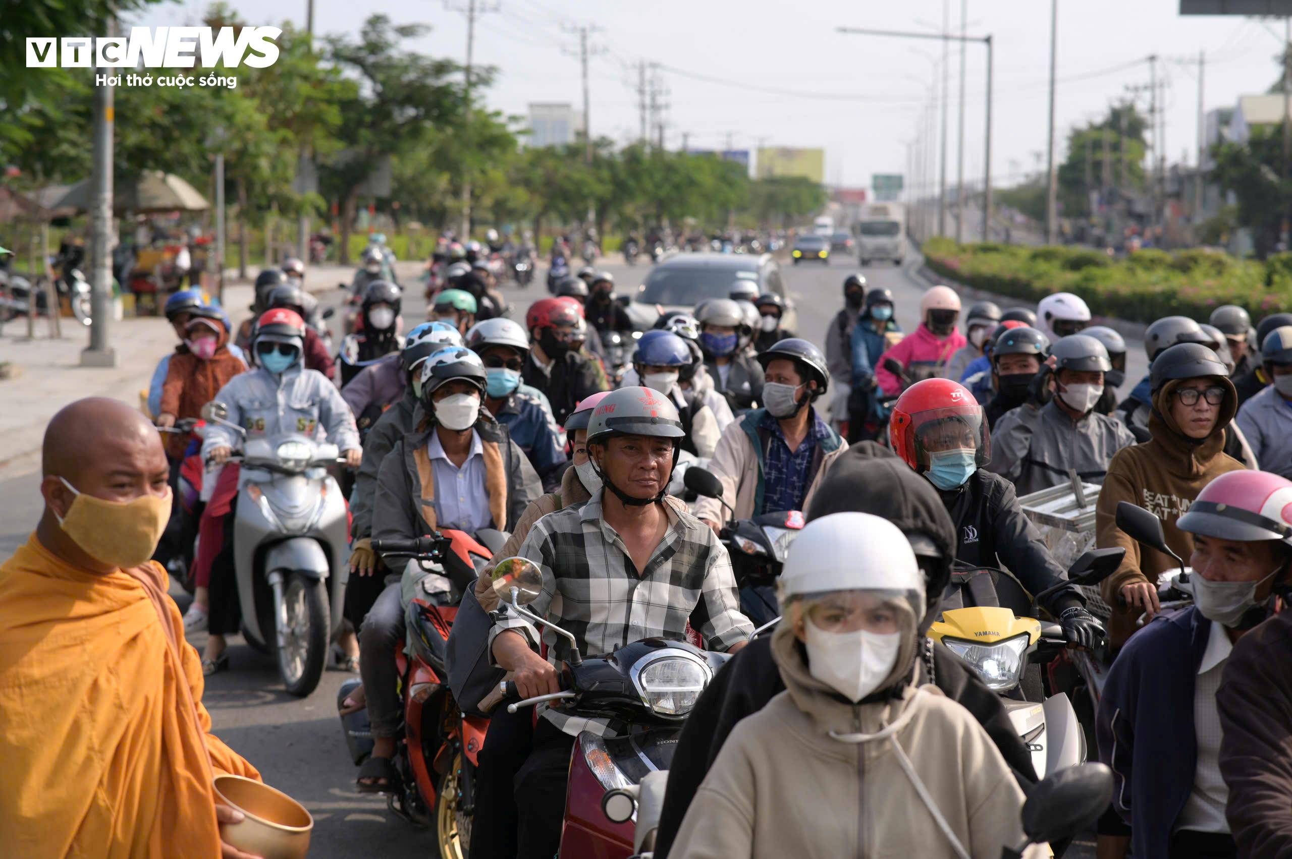 Đến 21h ngày 22/2 (mùng 6 Tết), khu vực cửa ngõ phía Tây TP.HCM vẫn đông phương tiện. Trên Quốc lộ 1 (đường Lê Khả Phiêu), dòng xe máy từ các tỉnh miền Tây đổ về nối dài nhiều đoạn, di chuyển chậm khi qua các giao lộ lớn và khu vực đèn tín hiệu.