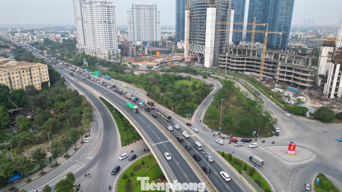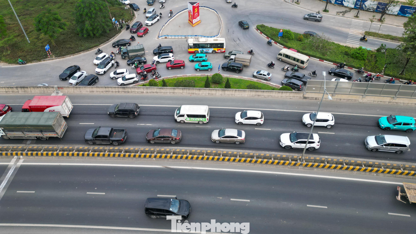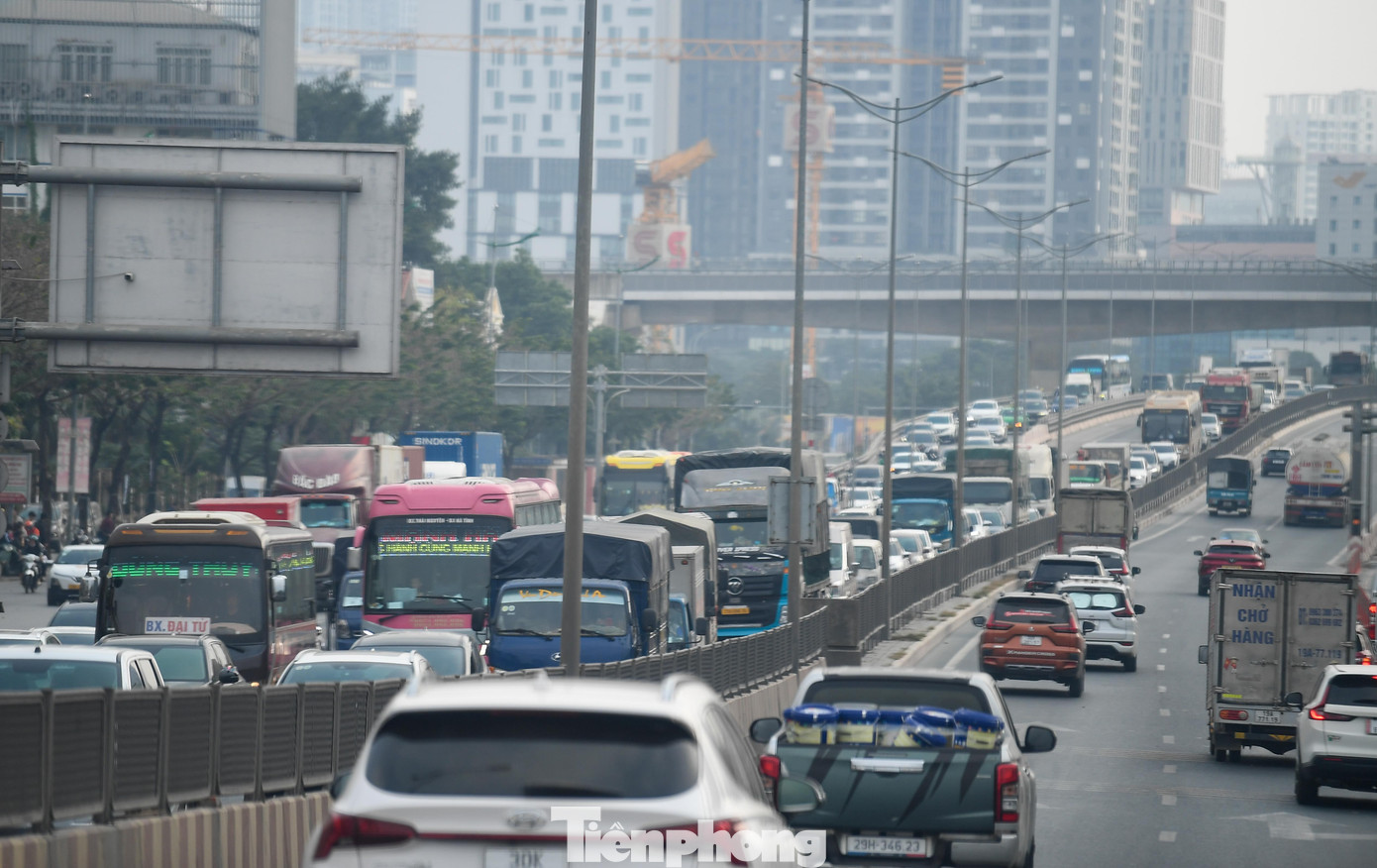 Chiều 31/12, lưu lượng phương tiện trên trục Phạm Văn Đồng gia tăng nhanh theo hướng đi cầu Thăng Long. Dòng xe ôtô, xe máy nối dài, di chuyển chậm, đặc biệt tại các nhánh rẽ, lối lên xuống và đường gom.