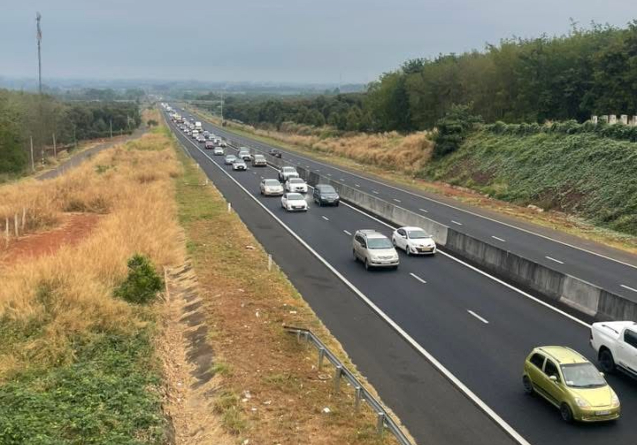 Càng về gần điểm giao với cao tốc Phan Thiết - Dầu Giây, lưu lượng phương tiện dồn về càng đông, khiến dòng xe ken đặc, di chuyển chậm từng mét. Có thời điểm, đoạn ùn tắc kéo dài gần 10 km.