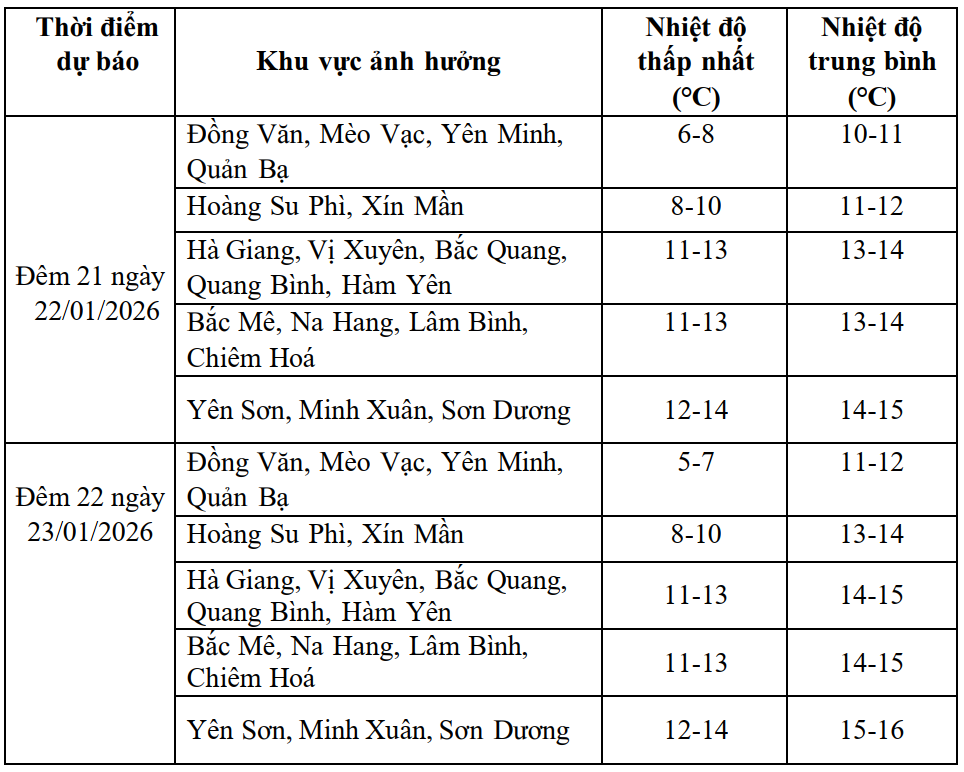 Dự báo đêm nay (21-1), bộ phận không khí lạnh này sẽ tiếp tục ảnh hưởng đến thời tiết các khu vực còn lại trong tỉnh. Gió chuyển hướng Đông Bắc cấp 2, cấp 3. Do ảnh hưởng của không khí lạnh, trên địa bàn tỉnh Tuyên Quang từ đêm 21 - 22/1 có mưa, mưa rào rải rác. Từ đêm 21-1 đến khoảng ngày 23-1 trời chuyển rét đậm, vùng núi cao rét hại. Nhiệt độ thấp nhất trong đợt không khí lạnh này phổ biến từ 11-13°C; vùng núi cao phía Bắc tỉnh từ 5-7°C.