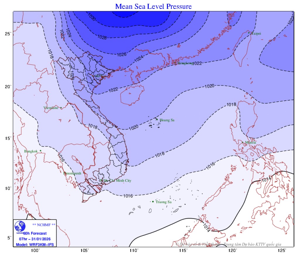 Trên biển, từ gần sáng 31-1, vịnh Bắc Bộ có gió Đông Bắc mạnh cấp 5, có lúc cấp 6, giật cấp 7-8; biển động, sóng cao 1-2m. Vùng biển phía Đông Bắc của khu vực Bắc Biển Đông có gió mạnh cấp 6, giật cấp 7-8, sóng cao 2-4m.