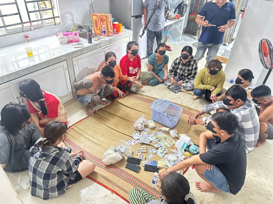 Tại hiện trường, lực lượng Công an phát hiện 14 đối tượng đang tham gia đánh bạc dưới hình thức bài binh sáu lá. Tang vật thu giữ, gồm: 22 bộ bài tây và số tiền hơn 103 triệu đồng cùng nhiều dụng cụ liên quan khác.