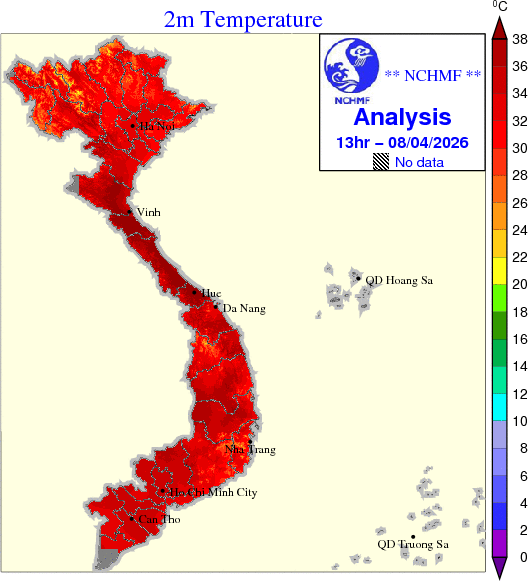 Bản đồ phân bố nhiệt độ lúc 13 giờ chiều ngày 8/4. Nguồn: Trung tâm Dự báo khí tượng thủy văn quốc gia