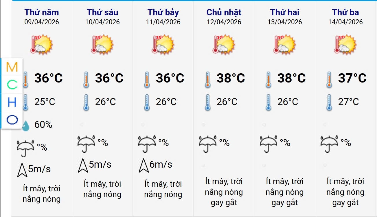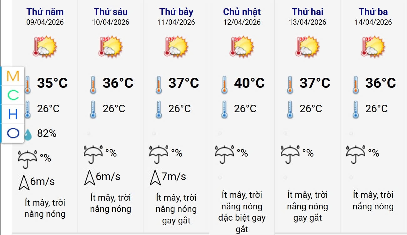 Vì thế, riêng khu vực Trung Bộ từ tỉnh Thanh Hóa đến thành phố Đà Nẵng và phía đông các tỉnh Quảng Ngãi, Gia Lai, từ ngày 9 đến 14/4 có nắng nóng gay gắt, với nhiệt độ cao phổ biến từ 36 - 39°C; trong đó, khu vực các tỉnh từ Nghệ An đến thành phố Huế có nắng nóng gay gắt và đặc biệt gay gắt với nhiệt độ cao phổ biến 39 - 40°C, có nơi trên 41°C.