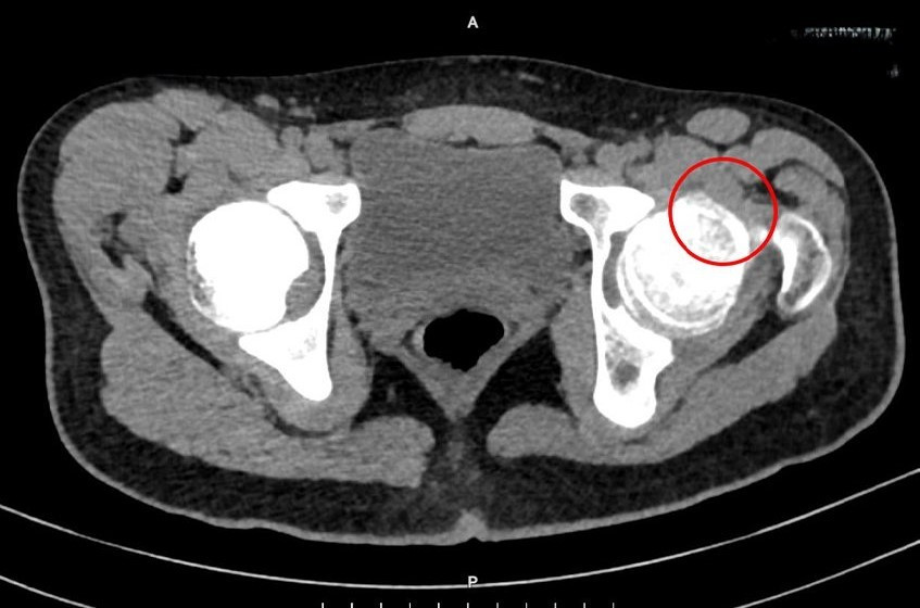 Hình chụp CT khớp háng bên trái, trên chỏm xương đùi có mô xương (khoanh tròn) nhô cao lên rõ rệt - Ảnh BVCC