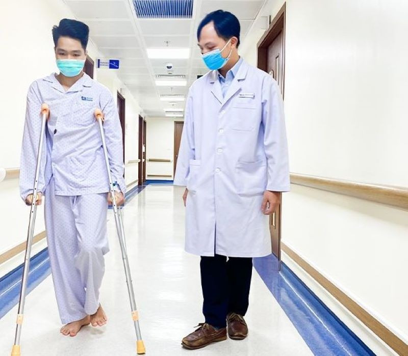 P. tập đi lại cùng bác sĩ Trường vào ngày thứ 3 sau phẫu thuật - Ảnh BVCC