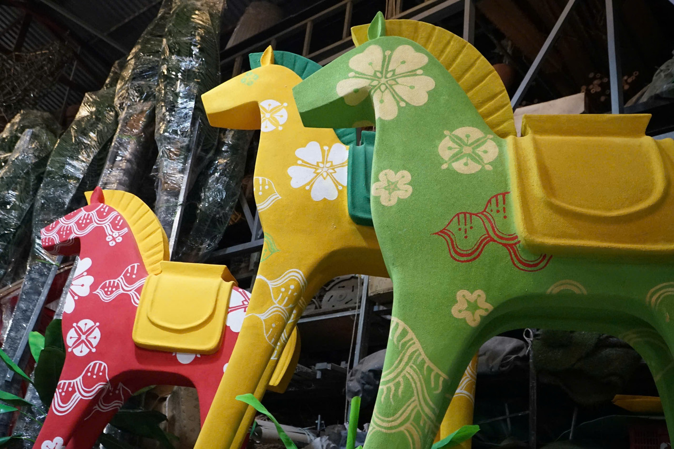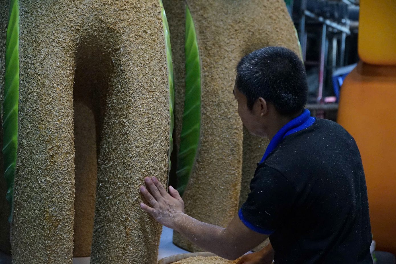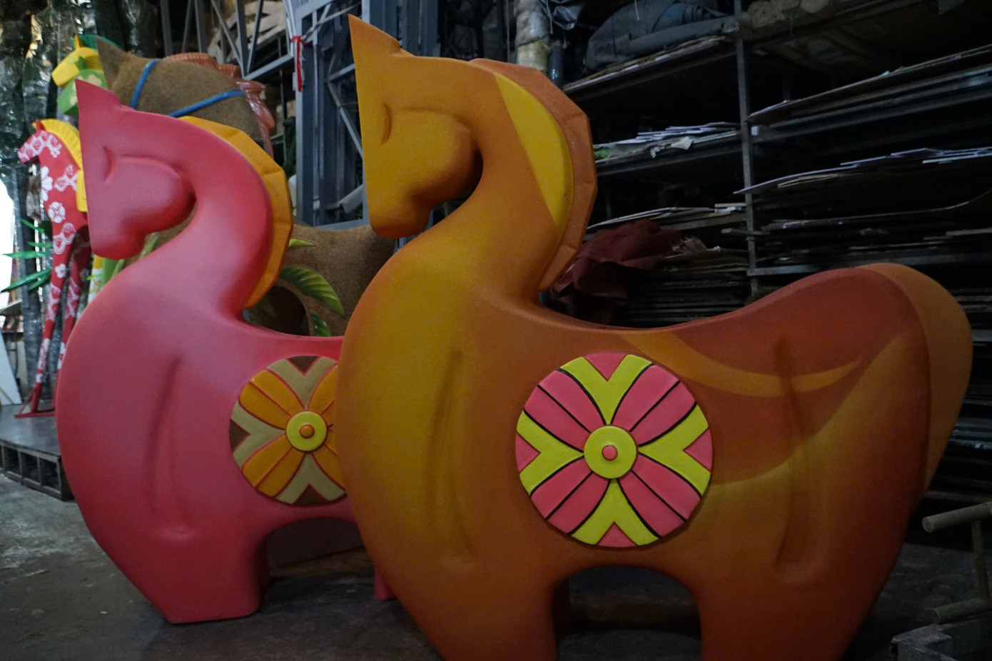 Tại xưởng của nghệ nhân Văn Tòng, không khí lao động diễn ra nhộn nhịp từ sáng đến tối. Ông Tòng đã gắn bó với việc chế tác linh vật cho Đường hoa nhiều năm liền và năm nay ông tiếp tục đảm nhận phần thi công linh vật ngựa trung tâm.