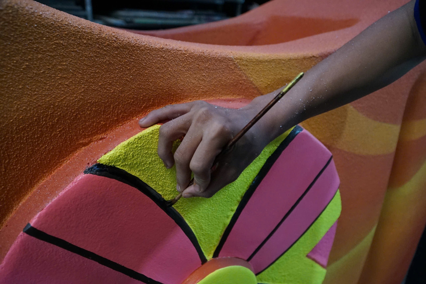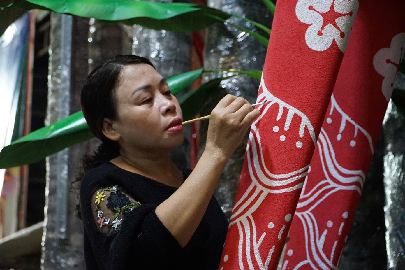 Trong quá trình hoàn thiện linh vật, khâu vẽ mỹ thuật được xem là một trong những phần việc đòi hỏi độ chính xác và tỉ mỉ cao nhất. Công đoạn này do chị Nguyễn Thị Thanh Huyền - thợ mỹ thuật có hơn mười năm kinh nghiệm - trực tiếp đảm nhiệm. Nhiệm vụ của chị là thể hiện hoa văn, tạo hình đường nét và phối màu trực tiếp lên bề mặt linh vật. "Thử thách lớn nhất là phải bám sát bản thiết kế đã được phê duyệt, tuyệt đối không tự ý điều chỉnh theo cảm xúc cá nhân. Các họa tiết hoa mai, mây cách điệu mang phong cách truyền thống được xử lý kỹ lưỡng, mềm mại và rõ nét, góp phần tạo nên thần thái cho linh vật", chị Huyền nói.