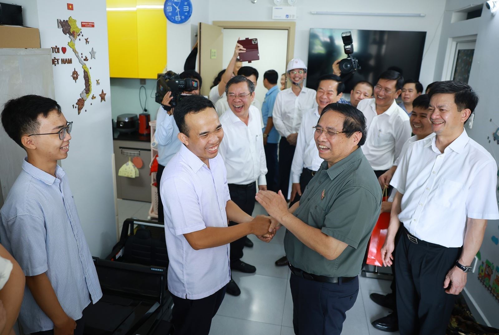 Thủ tướng Phạm Minh Chính thăm hộ dân sinh sống tại Khu nhà ở xã hội của thành phố Cần Thơ. Ảnh: Dương Giang/TTXVN