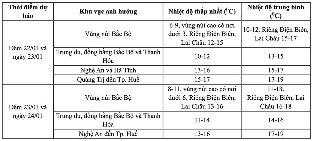Nhiệt độ thấp nhất ở Bắc Bộ và Thanh Hóa phổ biến 10-12°C, trong đó, vùng núi 6-9°C, vùng núi cao có nơi dưới 3°C, Nghệ An đến TP Huế 13-16°C.
