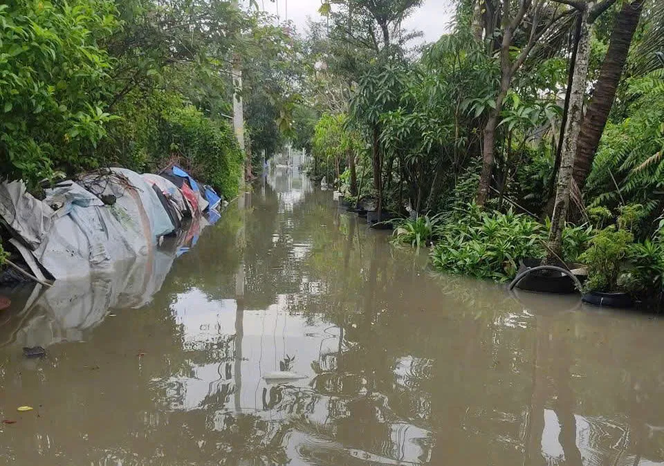 Tại phường An Phú Đông, nước tràn bờ tại một số vị trí thuộc dự án công trình thủy lợi bờ hữu ven sông Sài Gòn gây ngập cục bộ các tuyến đường và khu dân cư.