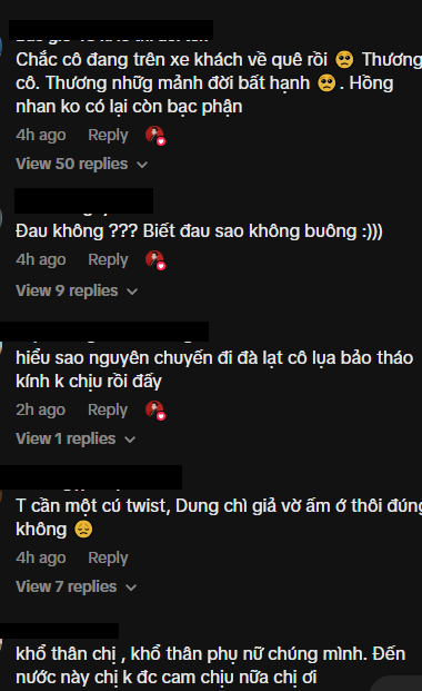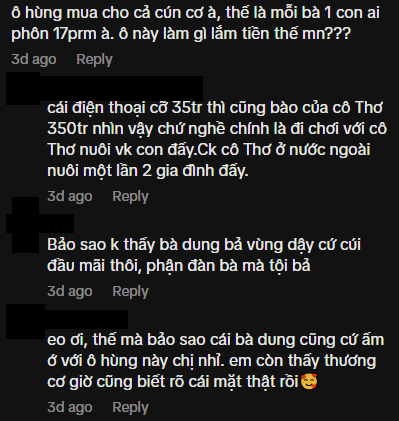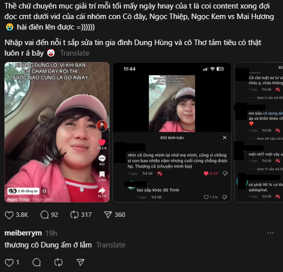 Phần bình luận dưới các video này cũng trở thành "đại hội nhập vai" khi netizen trở thành những người hàng xóm, bạn cũ, họ hàng... Từ đây, "thuyết âm mưu" về "drama" Thơ - Hùng - Dung - Lụa càng thêm căng: Người thương cho cô Dung ấm ớ bị đối xử tệ mà cam chịu, người nghi ngờ cô Dung chỉ giả vờ để thu thập bằng chứng hoặc "bào tiền" của chồng, người tò mò ông Hùng giàu cỡ nào mà "một lúc nuôi hai bà", có dân mạng đoán ông Hùng chỉ giả vờ cưng chiều cô Thơ để lấy tiền nuôi gia đình do chồng cô Thơ đi làm ở nước ngoài...