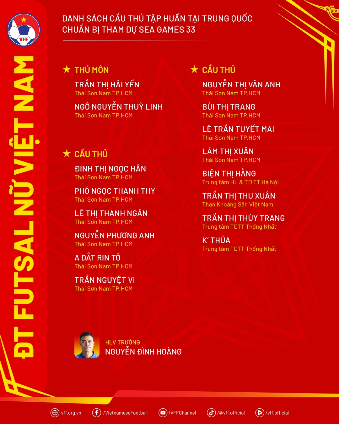 Danh sách cầu thủ ĐT Futsal nữ Việt Nam tập huấn tại Trung Quốc chuẩn bị cho SEA Games 33