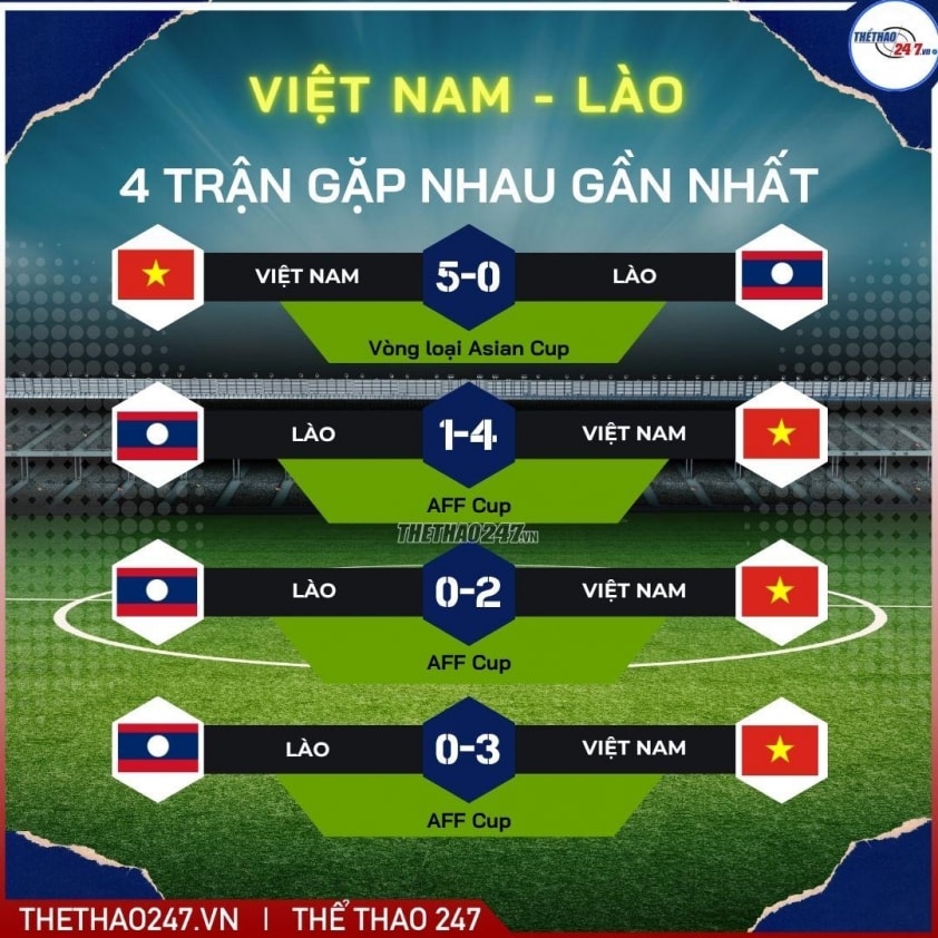 Việt Nam toàn thắng trước Lào trong 4 lần gặp nhau gần nhất.