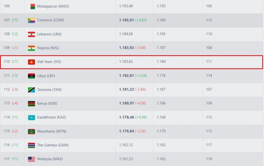 Theo cập nhật mới nhất từ trang Football Ranking, đội tuyển Việt Nam đã tăng một bậc trên bảng xếp hạng FIFA, từ vị trí 111 lên 110 thế giới. Sự cải thiện này đến ngay cả khi đội tuyển chưa thi đấu trận gặp Lào tại vòng loại Asian Cup 2027.