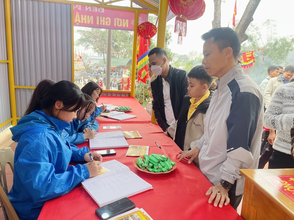 Lực lượng đoàn viên thanh niên hỗ trợ ghi nhận công đức tại di tích Phủ Na.