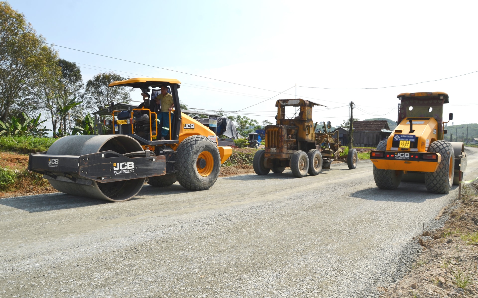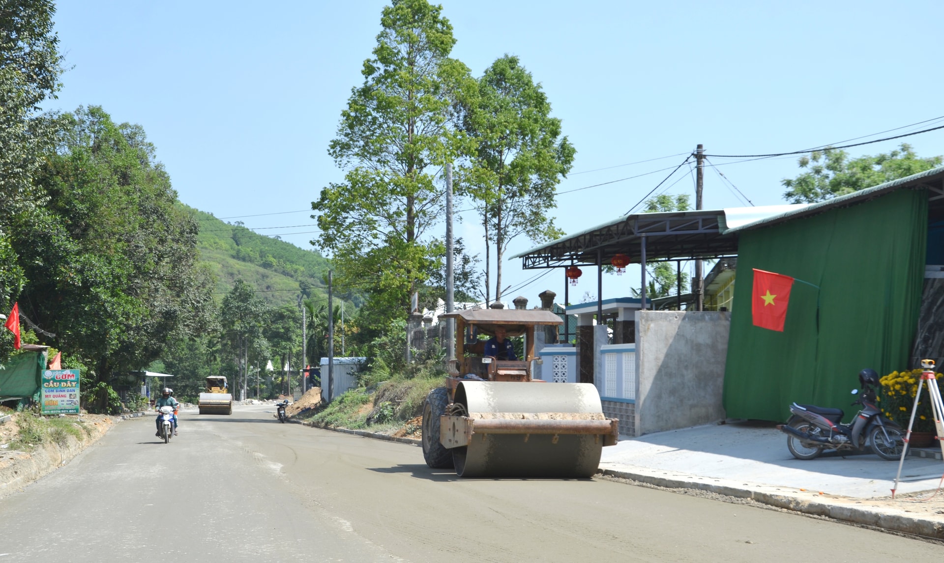 Ở những vị trí khác qua địa bàn các xã Việt An, Phước Trà và Phước Hiệp, công nhân hối hả đào đắp móng nền, lu lèn lớp cấp phối đá dăm cuối cùng để chờ thời tiết thuận lợi sẽ tiến hành thảm bê tông nhựa lớp 1.