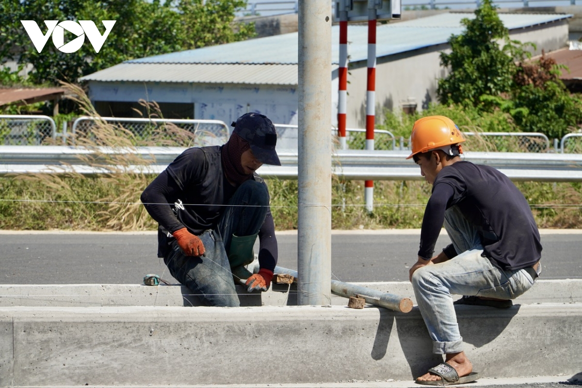 Công nhân đang thi công phần trụ chiếu sáng đoạn qua phường Tam Long (TP Bà Rịa cũ), TP.HCM