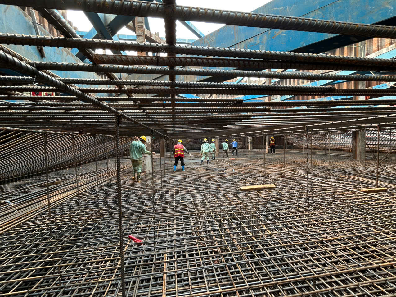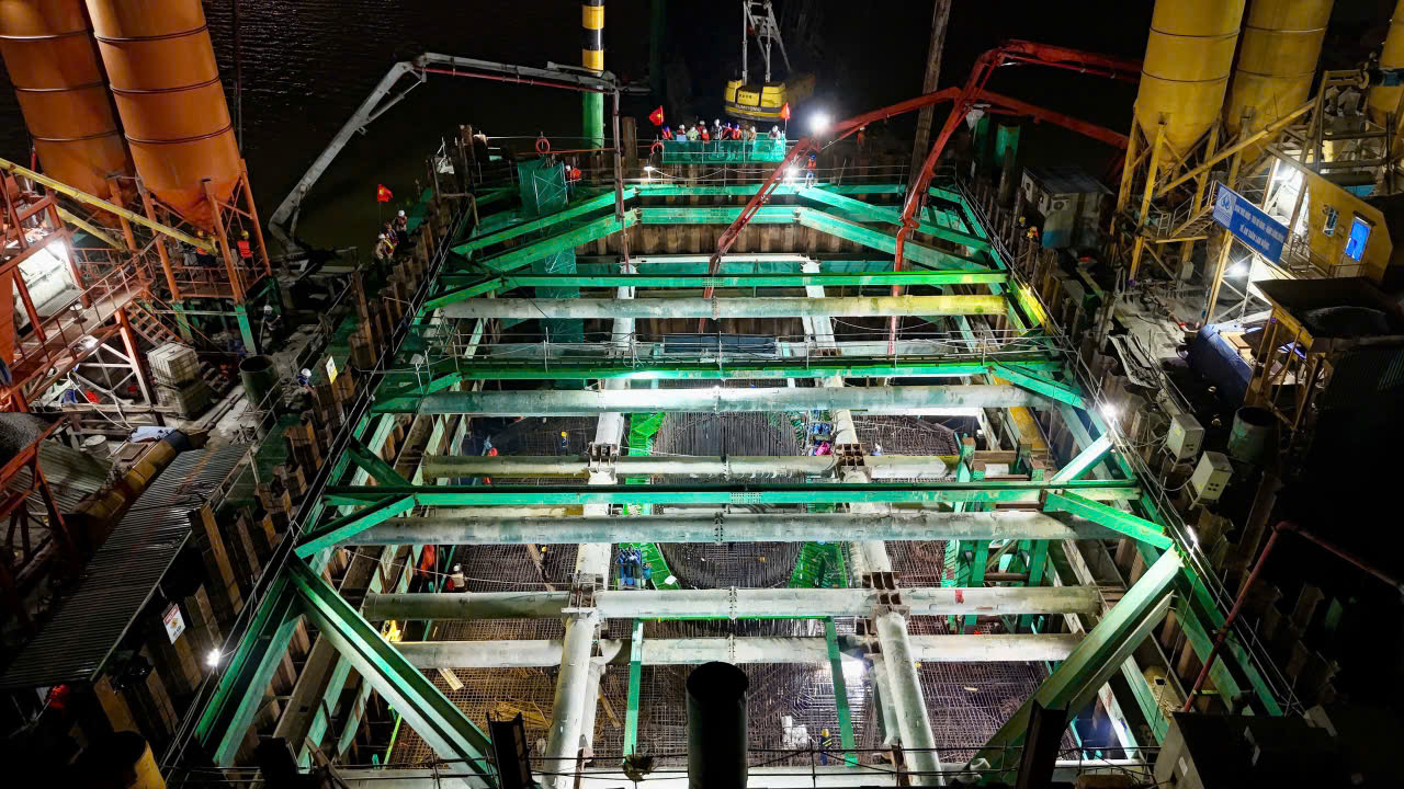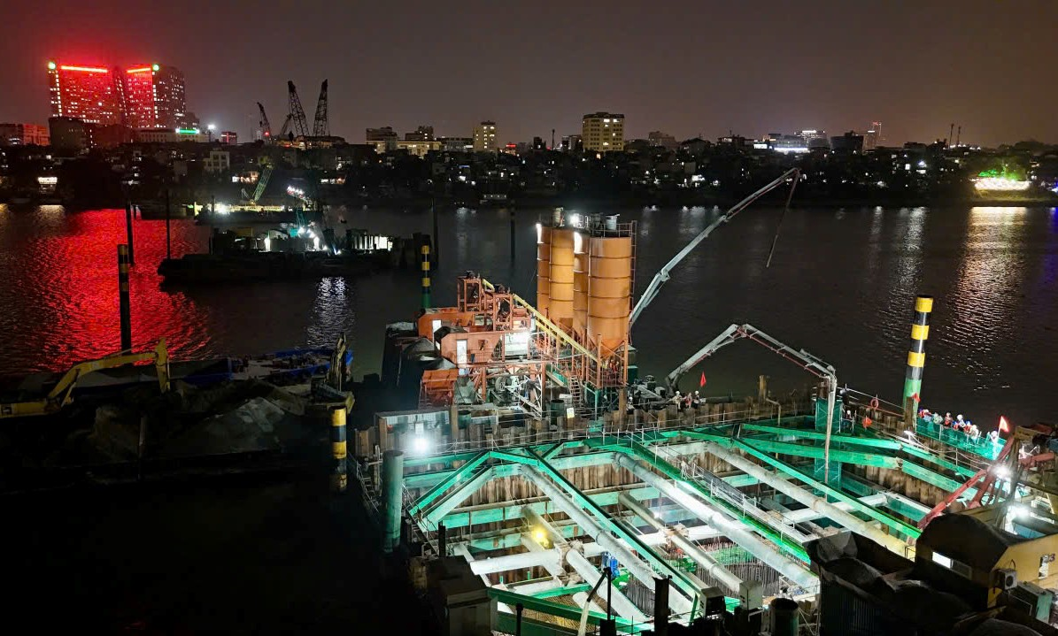 Giữa lòng sông Hồng, những trụ cầu chính của dự án xây dựng cầu Trần Hưng Đạo đang khẩn trương thi công. Công trường dự án nhộn nhịp ngày đêm. Có mặt tại vị trí thi công trụ cầu TC5, một trong những trụ chính của cầu ở giữa lòng sông, dù trời đã về đêm, chúng tôi chứng kiến nhịp điệu lao động khẩn trương nơi đây. Từng tốp công nhân hăng say làm việc, những thanh sắt vững chãi được đan vào nhau đều tăm tắp, mật độ dày đặc, sẵn sàng đổ bê tông bệ trụ.