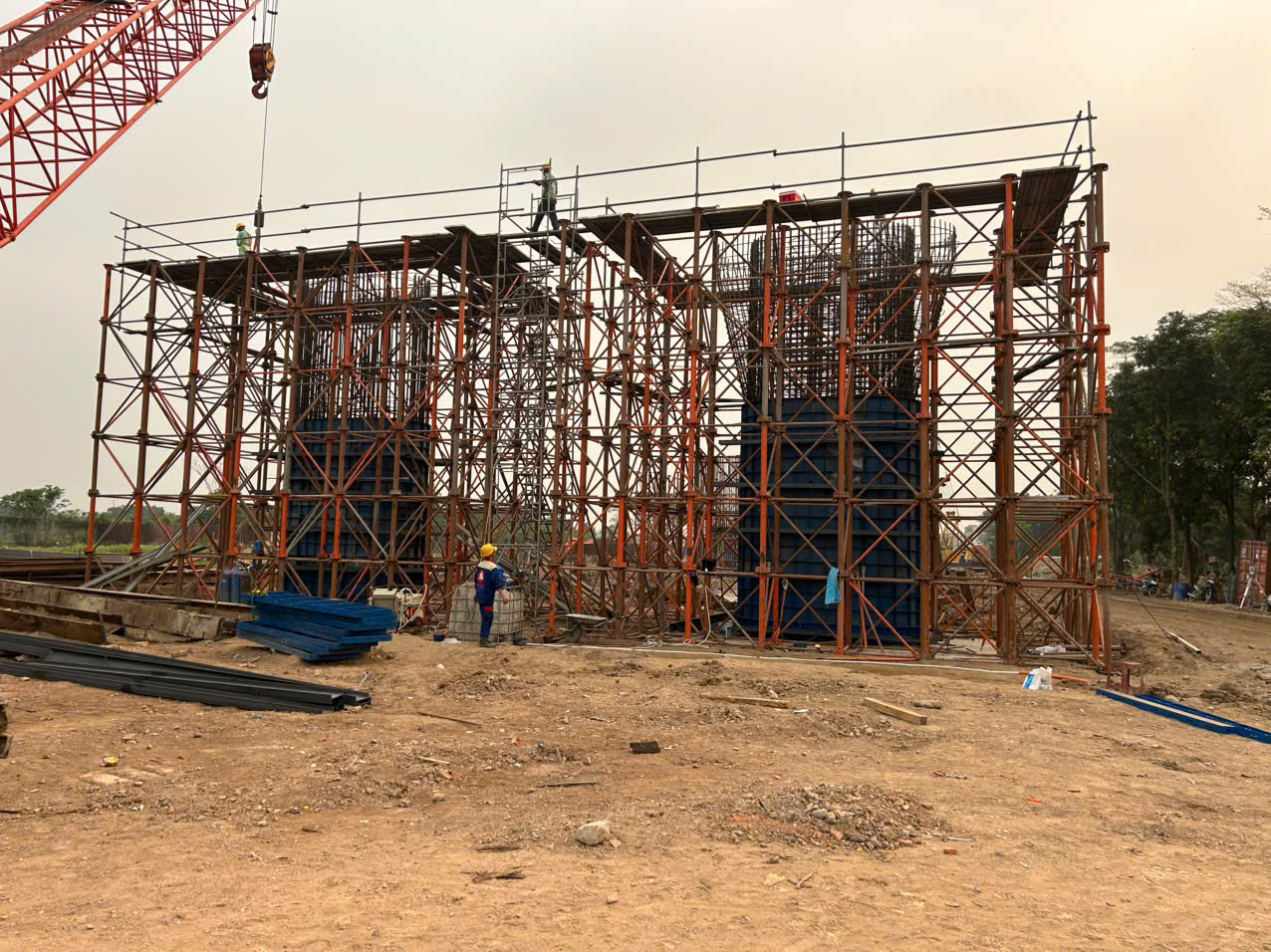 Thi công trụ cầu chính giữa sông, sẵn sàng vượt lũ tiểu mãn.