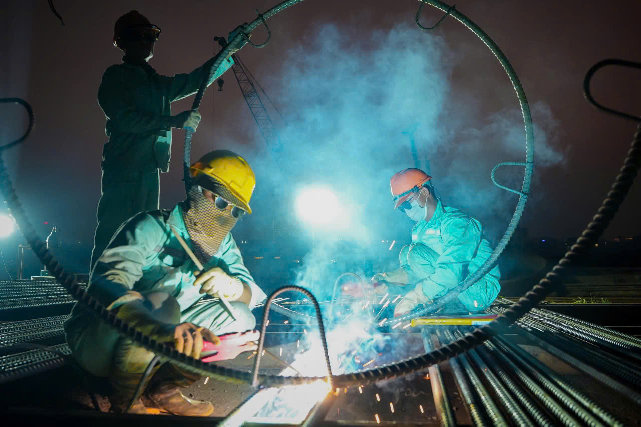 Trên công trường, công nhân làm việc 3 ca liên tục cả ngày và đêm.