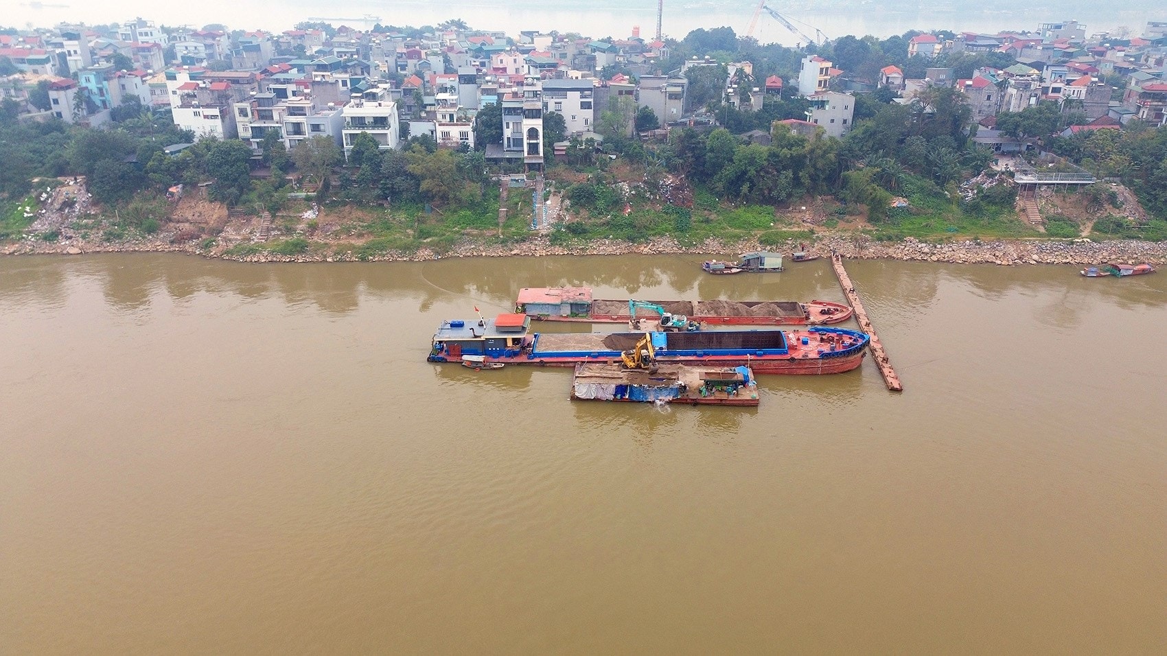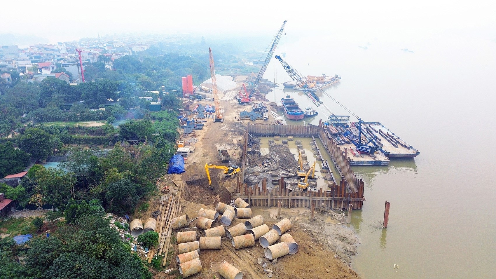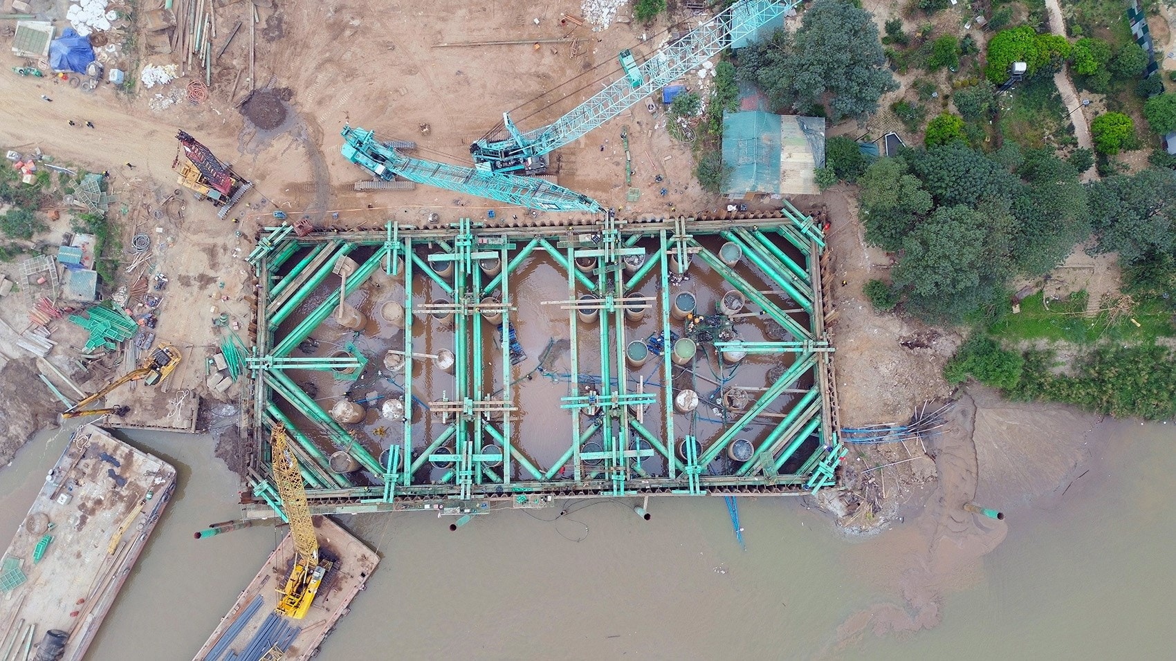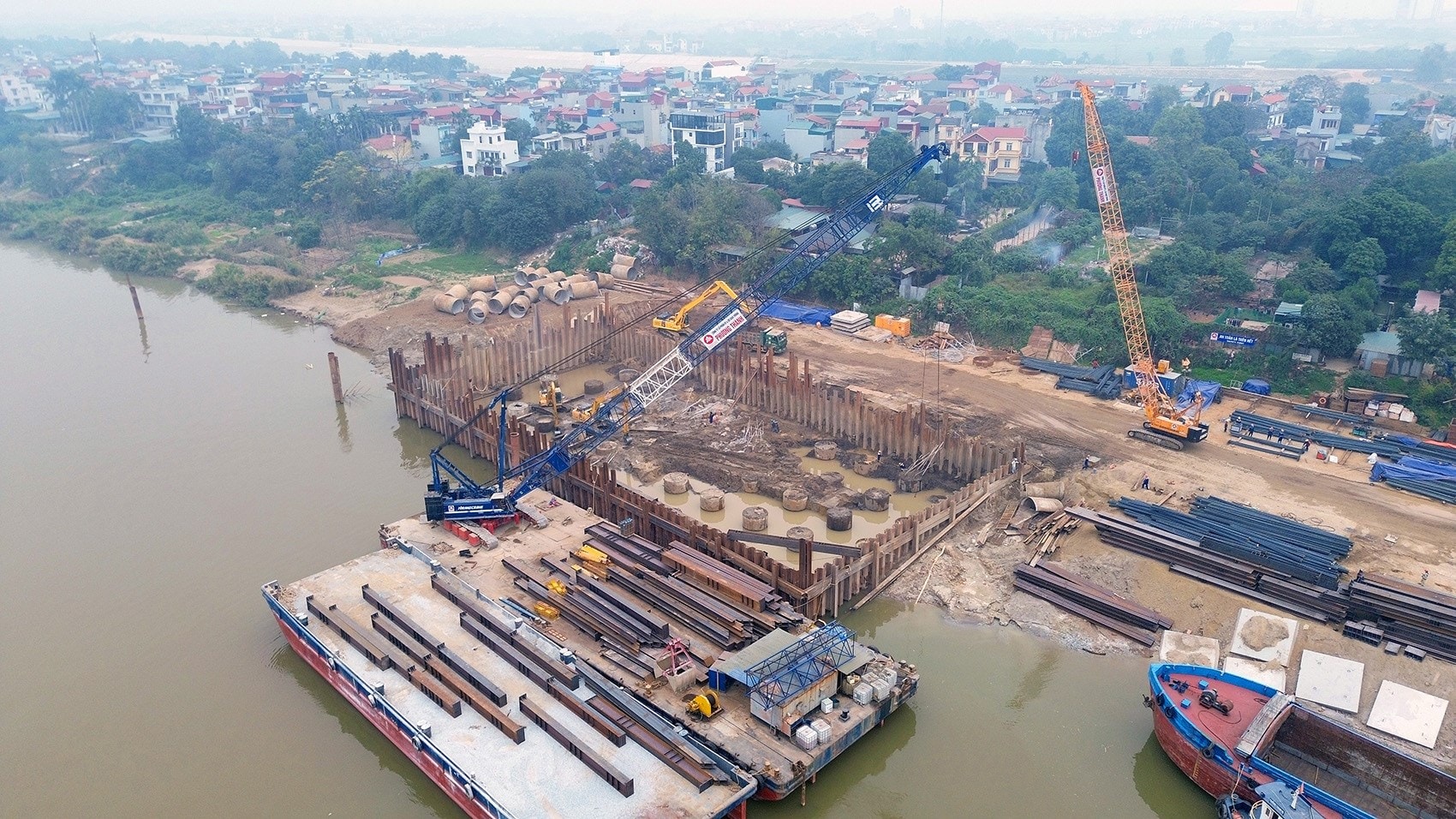 Hiệu nhà thầu Phương Thành đang thi công trụ cầu ngay sát bờ sông Hồng.