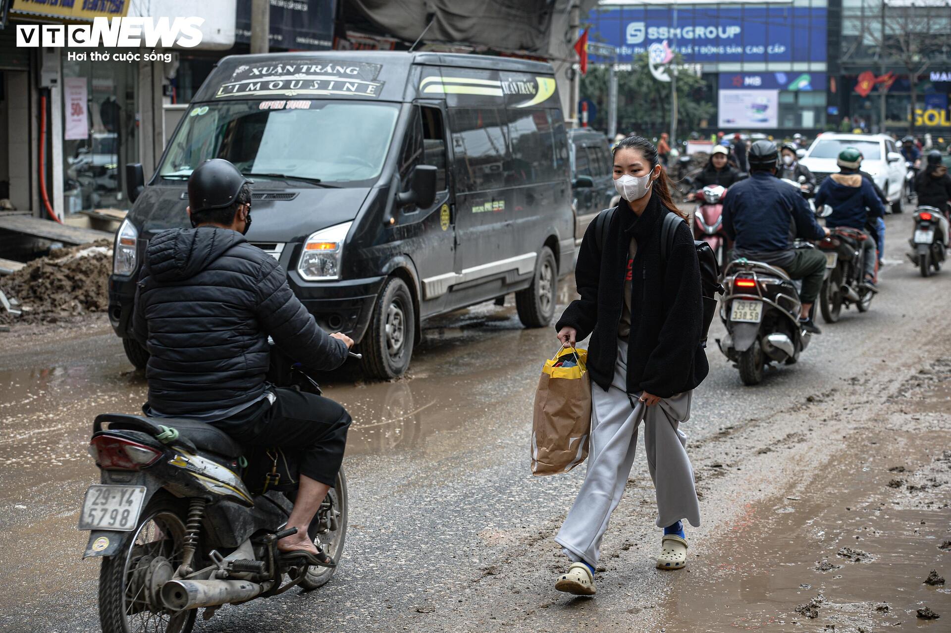 Hai bên tuyến đường tập trung nhiều chung cư và trường học nên lưu lượng người qua lại luôn đông. Trong điều kiện mặt đường lầy lội, nhiều phụ huynh phải dắt tay hoặc bế con qua đoạn bùn để vào trường.